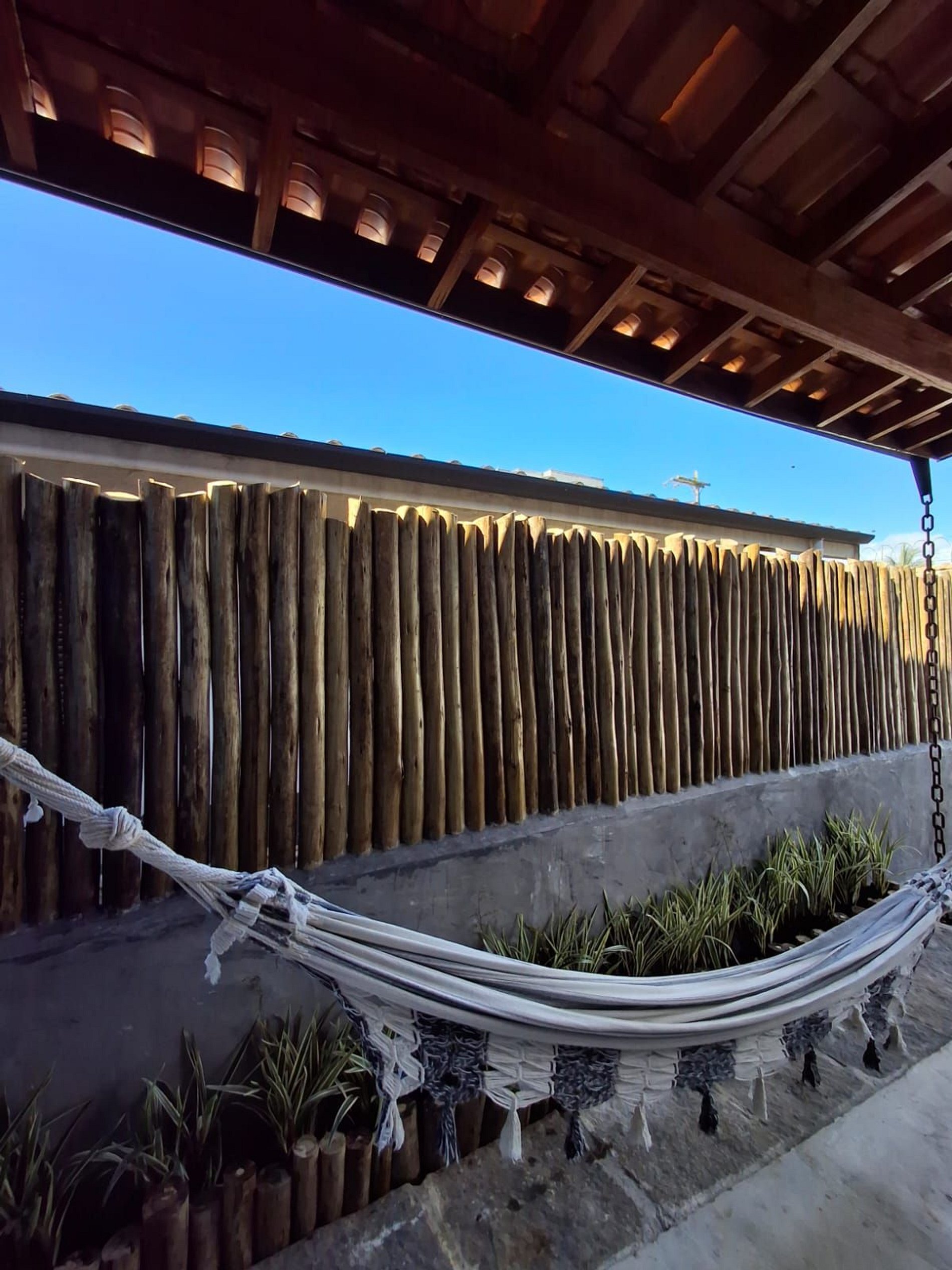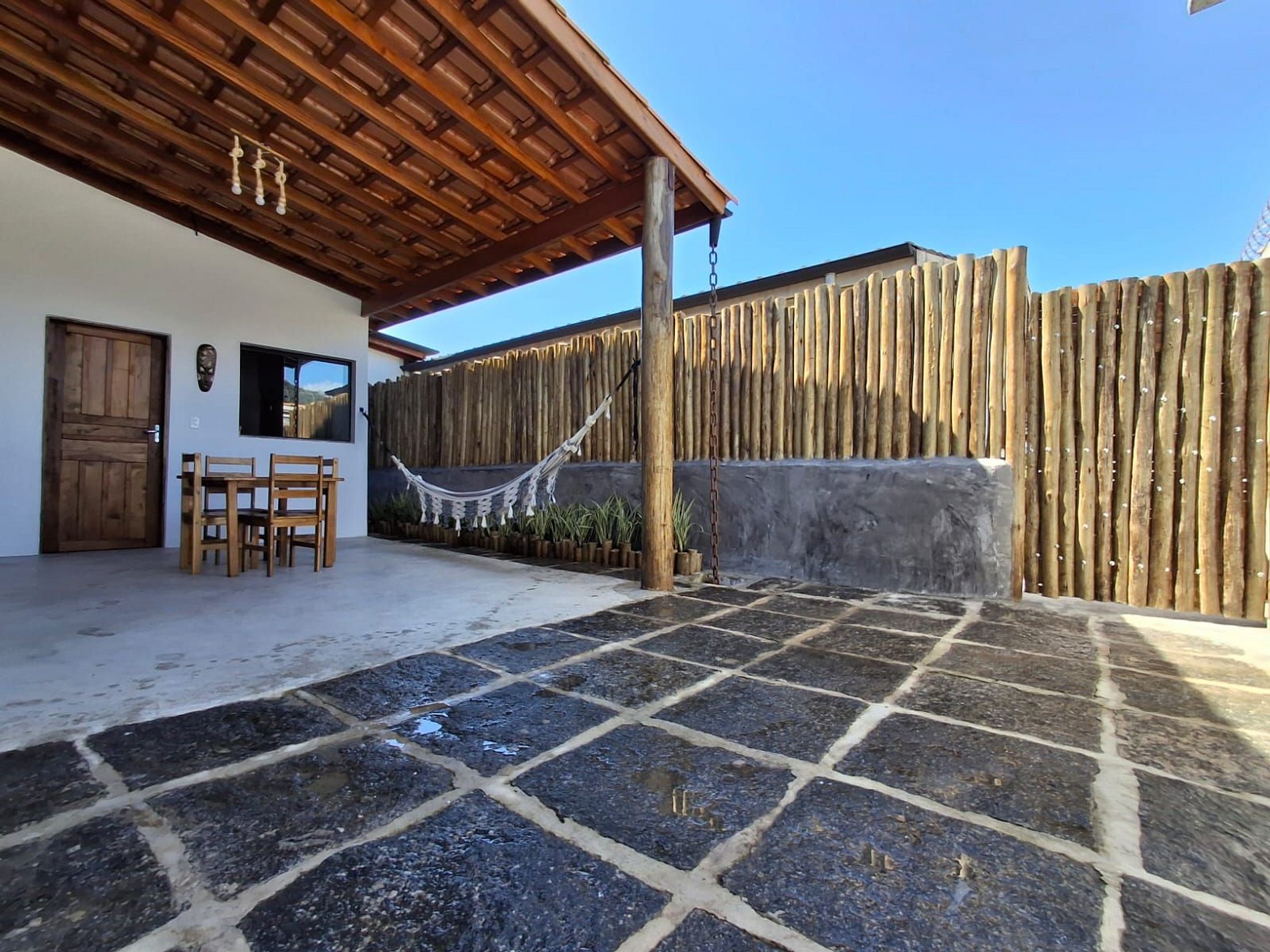 Toda integrada, na área externa com a churrasqueira e a cozinha, mesa para refeições e rede para descansar
