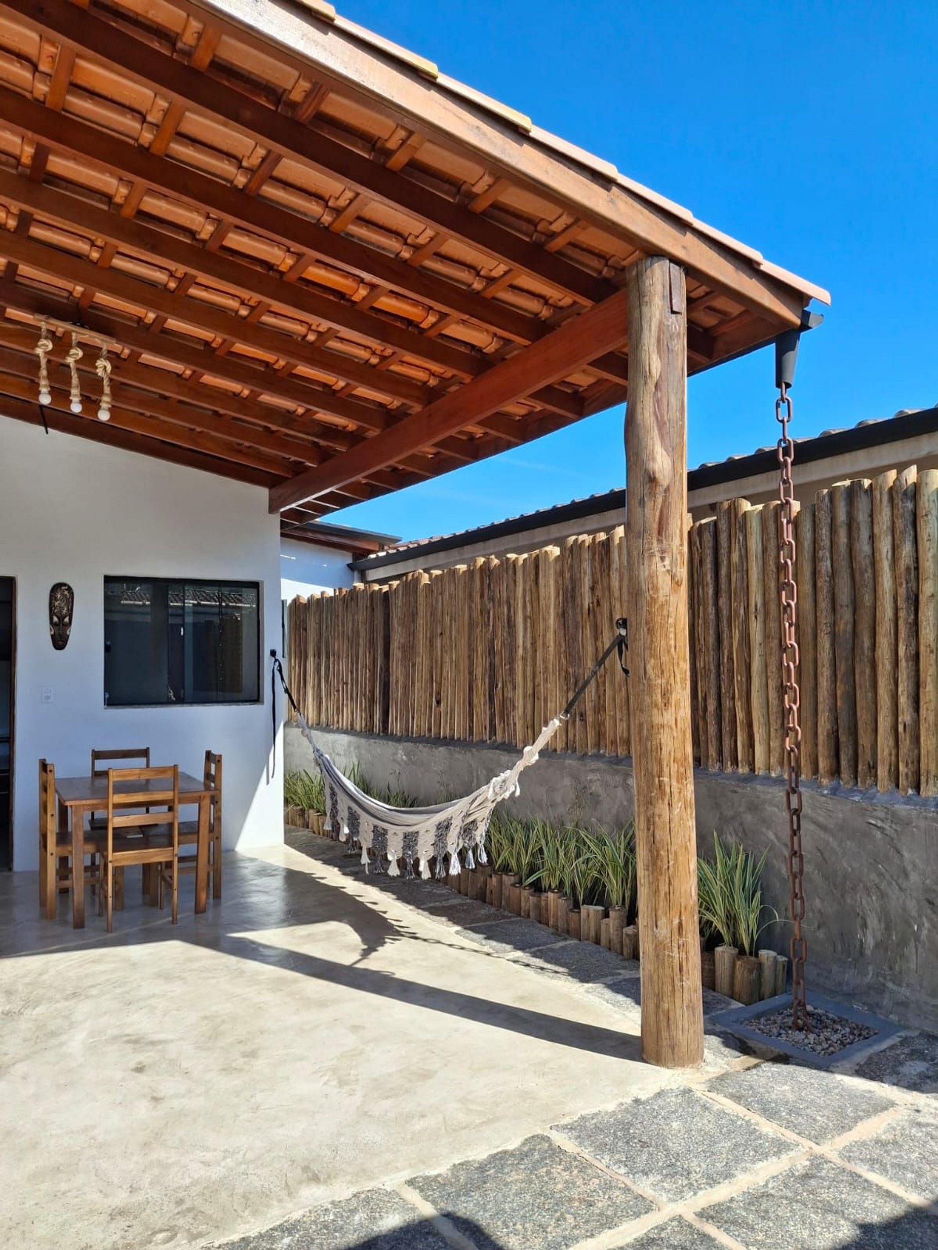 Toda integrada, na área externa com a churrasqueira e a cozinha, mesa para refeições e rede para descansar